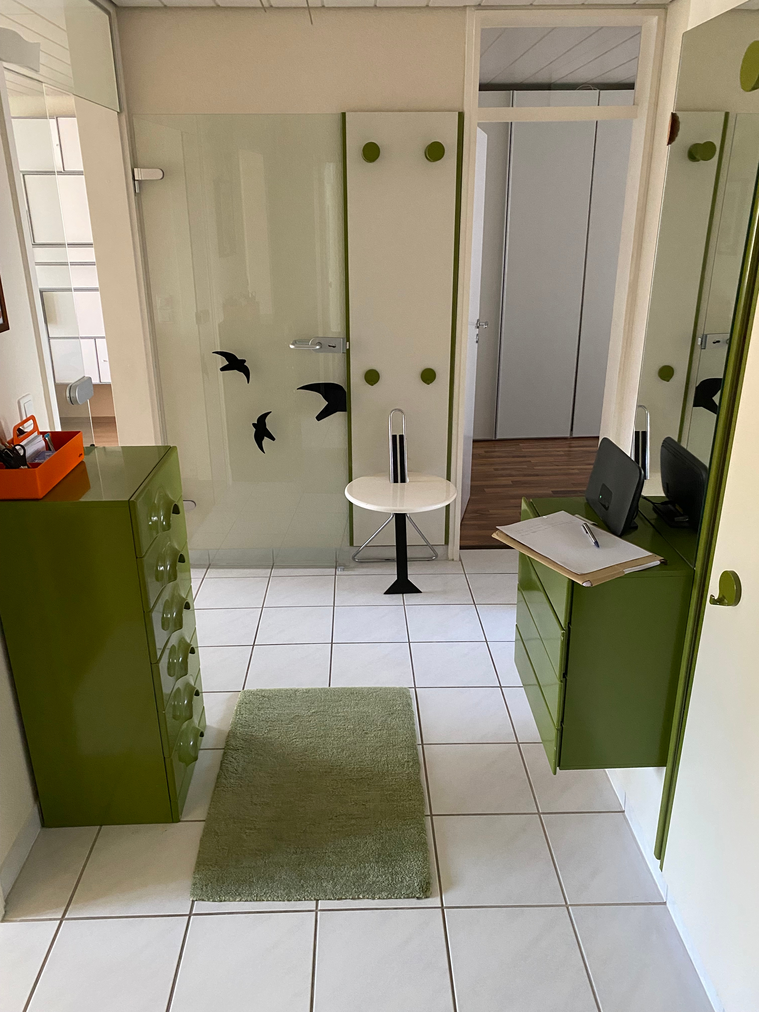 In der Wohnung sorgt eine elegante Glastür vom Flur ins Wohnzimmer für eine helle, offene Wirkung und ein freundliches Raumgefühl.